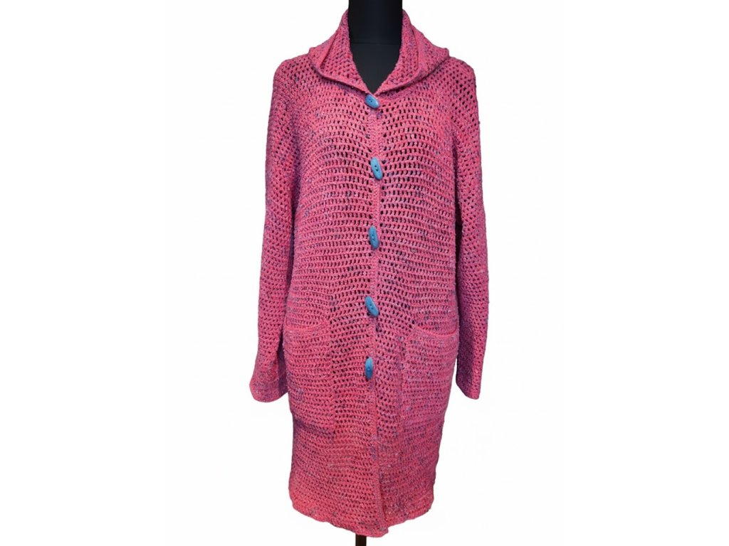 Tento háčkovaný kardigan s kapucí zaujme svou jasně růžovou barvou a zajímavou strukturou. Má prodloužený střih, zapínání na modré knoflíky a praktické kapsy. Prodloužené rukávy přidávají na komfortu a moderním vzhledu, ideální pro vrstvení.