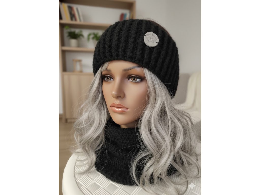 Tato široká, ručně háčkovaná čelenka je ideálním doplňkem pro chladné počasí, který dokonale kombinuje teplo a styl. Je vyrobena z měkké příze v černé byrvě a vyznačuje se hustým háčkovaným vzorem s výrazným žebrováním, které kryje uši a čelo. Čelenku zdobí elegantní, kulatý štítek s motivem a nápisem "handmade". Možno koupit současně s nákrčníkem ze stejné příze.