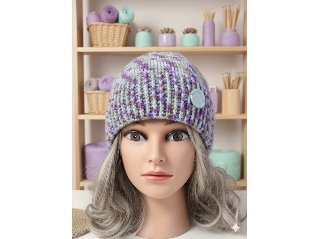 Tato ručně háčkovaná čepice zaujme svou jemnou strukturou a hravou kombinací fialových, zelených, šedých a modrých odstínů . Je vyrobena z příjemného materiálu, který poskytuje teplo i stylový vzhled. Díky originálnímu vzoru se stane jedinečným doplňkem pro chladnější dny.