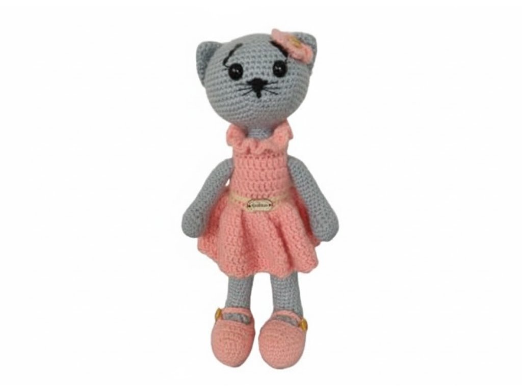 Elegantní šedá háčkovaná kočička v růžových volánkových šatičkách s pásečkem a kytičkou. Má bezpečnostní oči a růžové botky s knoflíčky. Perfektní handmade dekorace a společník.