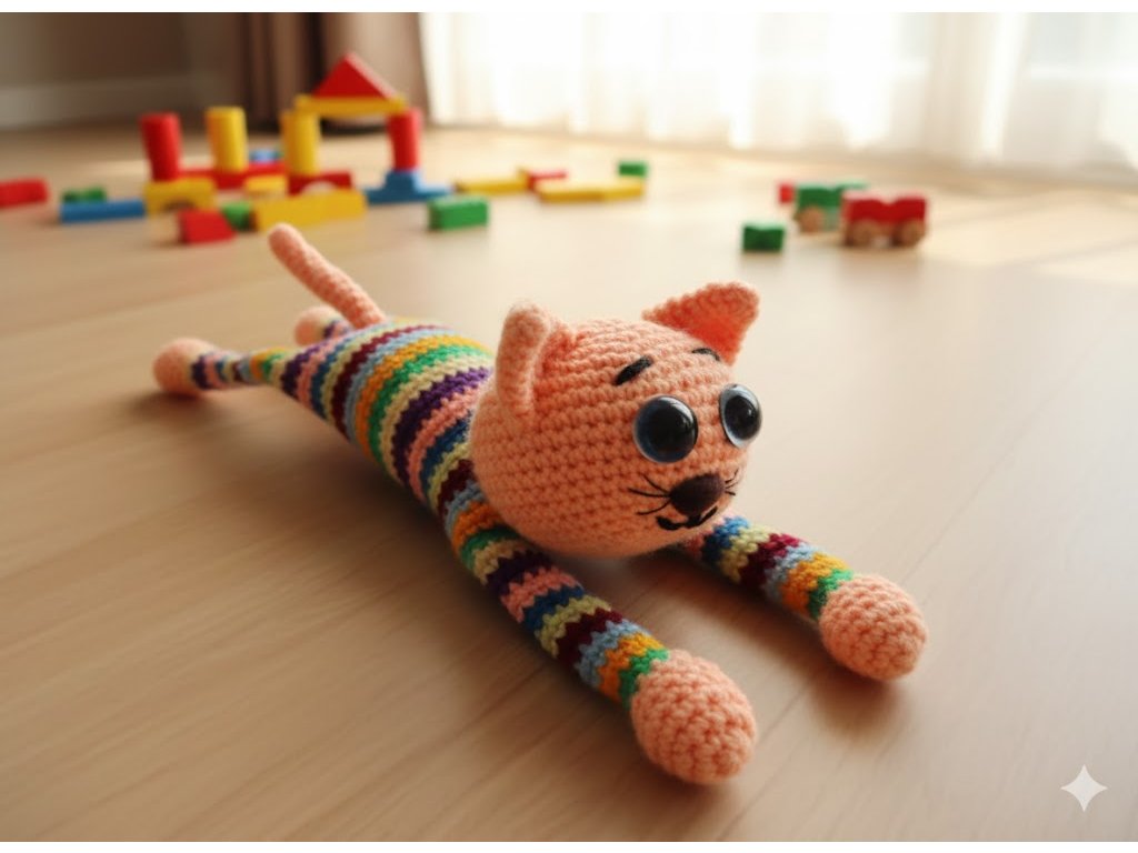 Tato roztomilá háčkovaná kočička je vyvedena v ležící pozici. Má různobarevné pruhování, bezpečnostní oči a roztomilý výraz. Je vyrobena ručně, což z ní činí ideální, měkkou něžnou dekoraci pro milovníky koček.