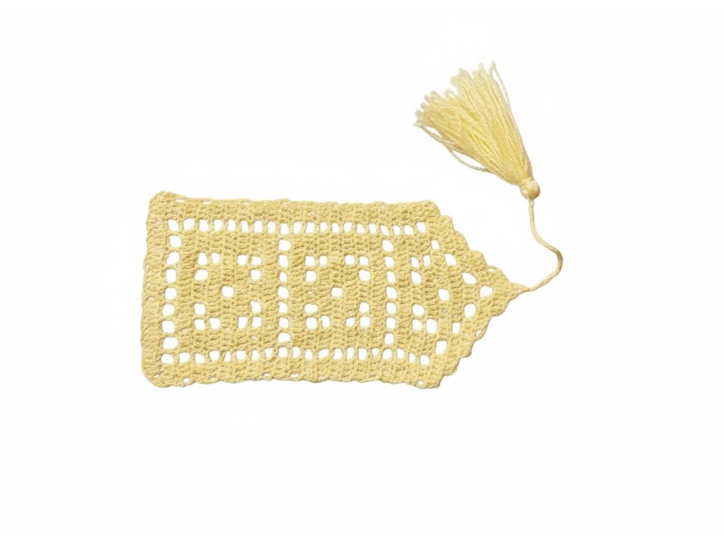 Tato jedinečná ručně háčkovaná záložka do knihy má prolamovaný, detailní krajkový vzor. Vyniká stylovou žlutou barvou a je zakončena bohatým střapcem. Její elegantní provedení a ruční práce z ní dělají krásný dárek pro každého milovníka knih.