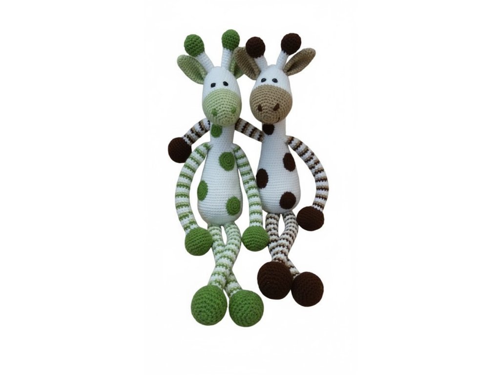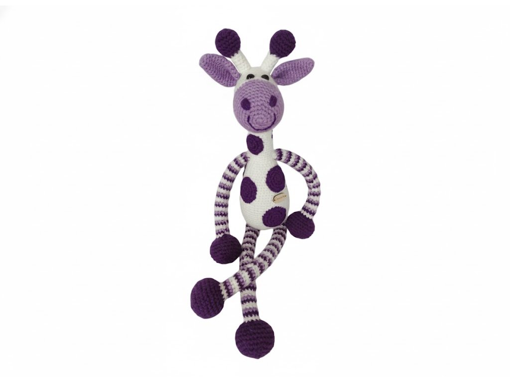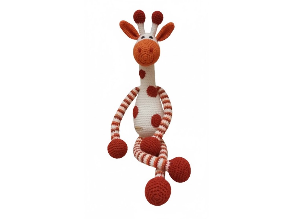 Originální ručně háčkovaná žirafa v různě barevných kombinacích. Má bílé tělíčko s velkými barevnými skvrnami a vesele pruhované končetiny. S dlouhým krkem a rozesmátým obličejem je ideální jako výrazný bytový doplněk.