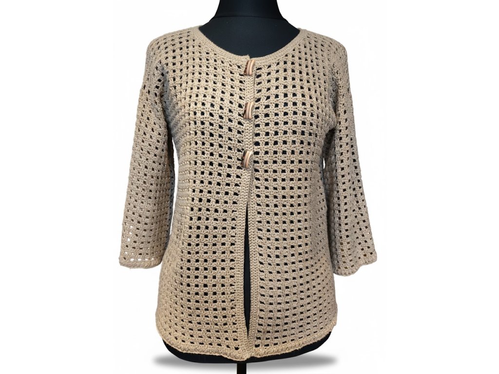 Ručně háčkované bolerko v elegantním, světle hnědém odstínu je lehký a stylový doplněk pro letní dny i slavnostní příležitosti. Jemný a propracovaný háčkovaný vzor dodává bolerku vzdušnost a romantický vzhled. Je ideální pro přehození přes šaty či top, dodá outfitu punc originality a ruční práce.