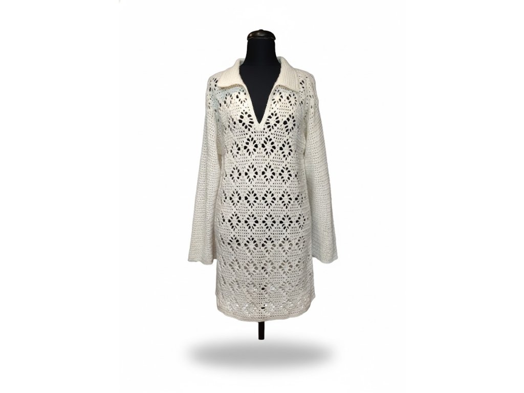 Lehké a vzdušné háčkované šaty s límečkem, které spojují eleganci, ruční práci a pohodlí. Každý kus je jedinečný originál – háčkováno s pečlivostí do posledního oka.