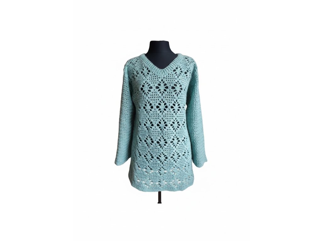 Ručně háčkovaný dlouhý svetr tyrkysový vel. M/L