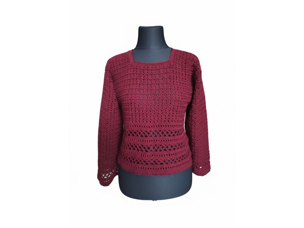 Elegantní ručně háčkovaný krátký svetr se zajímavým vzorem ve vínové barvě. Díky zkrácenému střihu se skvěle hodí k šatům nebo kalhotám s vysokým pasem. Precizní řemeslné zpracování a prodyšná textura z něj dělají stylový a nadčasový kousek, který dodá vašemu outfitu nádech romantiky a lehkosti.
