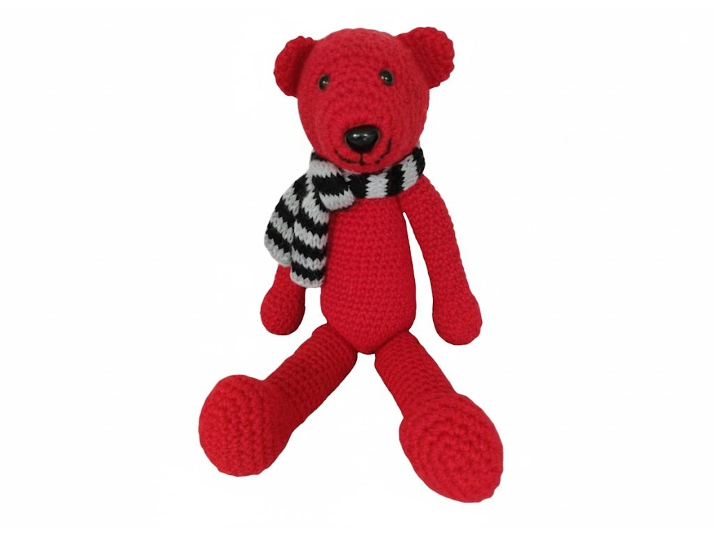 Tento veselý ručně háčkovaný medvídek v sytě červené barvě je připraven na podzimní a zimní dobrodružství. Má černé bezpečnostní očka, roztomilý čumáček a na krku nosí stylovou šedo-černou proužkovanou šálu. Sedící medvídek je ideální jako dekorace, nebo originální dárek pro radost.