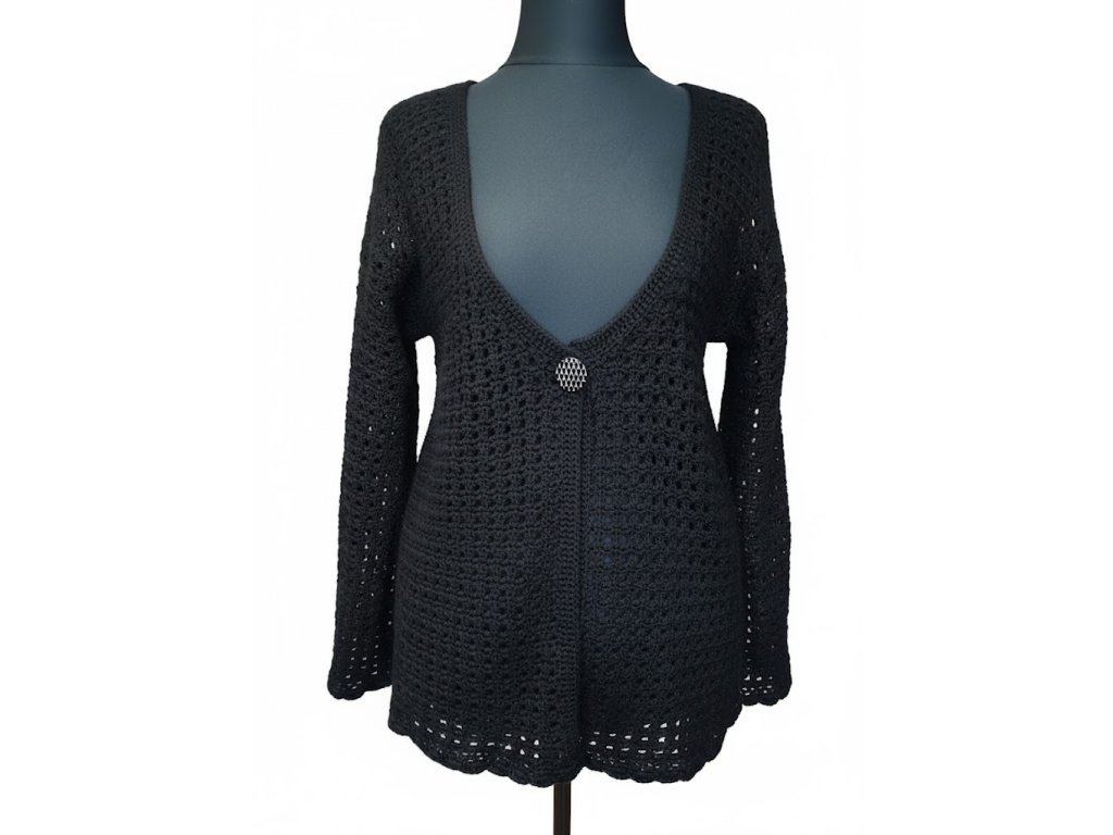 Tento elegantní ručně háčkovaný svetr v černé barvě se pyšní hlubokým V-výstřihem a zajímavou strukturou. Je řešený jako propínací, ale pro jednoduchý a sofistikovaný vzhled je zapínán pouze jedním výrazným ozdobným knoflíkem v horní části. Ideální jako stylový doplněk pro různé příležitosti.