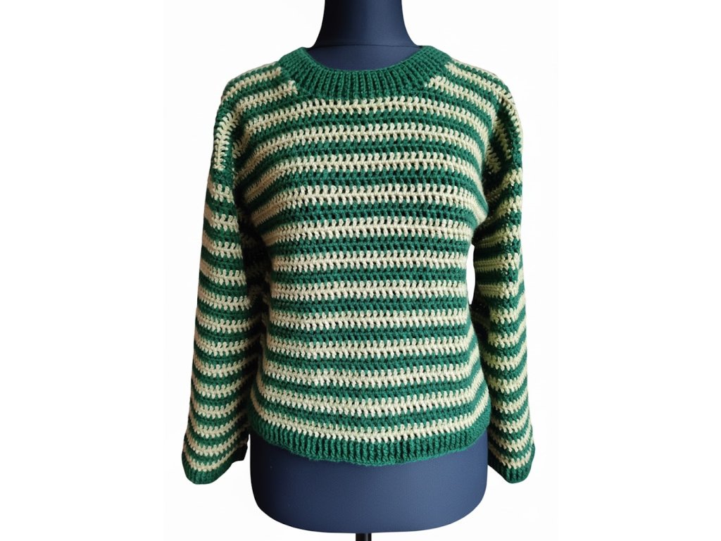 Jedinečný svetr v moderním střihu s jemným, ale výrazným háčkovaným vzorem. Každé oko je důkazem precizní ruční práce. Vyroben z kvalitní, nekousavé příze. Ideální pro milovníky udržitelné módy a originálních kousků.