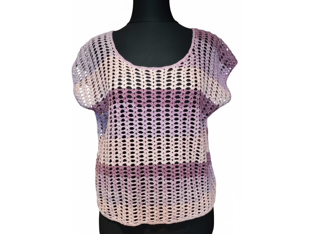 Tento vzdušný ručně háčkovaný širší top s kulatým výstřihem je ideální na léto. Vyniká lehkou strukturou a přechodovými odstíny fialové barvy. Volnější střih a krátké rukávy nabízejí maximální pohodlí. Je to stylový a prodyšný kousek pro horké dny.