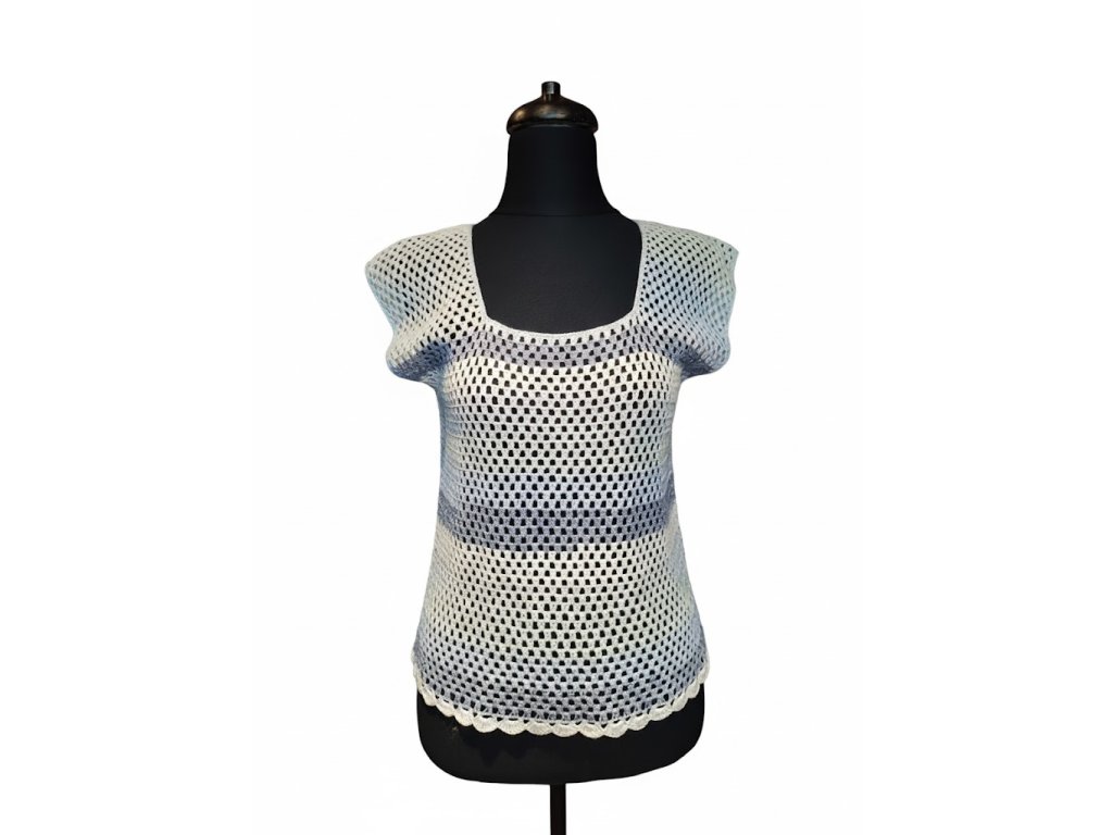 Tento originální ručně háčkovaný top bez rukávů s hranatým výstřihem je ideální letní kousek. Má lehkou strukturu a je z modré melírované příze. Spodní okraj zdobí vlnkované lemování. Skvělý pro vrstvení nebo horké letní dny.