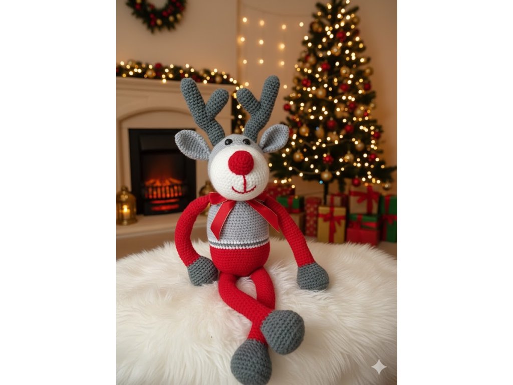 Tento roztomilý ručně háčkovaný vánoční sob je ideálním doplňkem pro sváteční výzdobu nebo jako dárek. Má šedé tělo s červenými detaily na nohou a rukou, bílou tvář a typický červený nos. Zdobí ho mašle pod krkem, což dodává sobovi hravý a veselý vzhled.