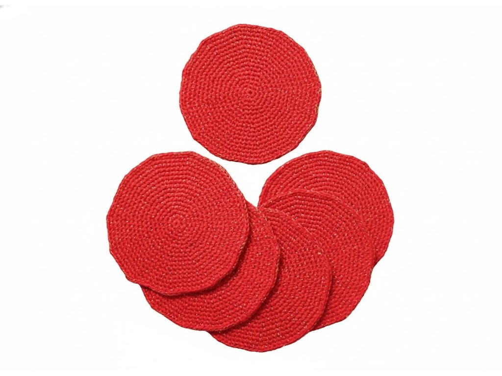 Toto elegantní kulaté vánoční prostírání je ručně háčkované ze sytě červené příze, která je protkána zlatou metalickou nitkou pro slavnostní lesk. Zaujme prolamovaným, detailním vzorem a je ideálním doplňkem pro vytvoření luxusní a tradiční atmosféry u sváteční tabule během Vánoc.